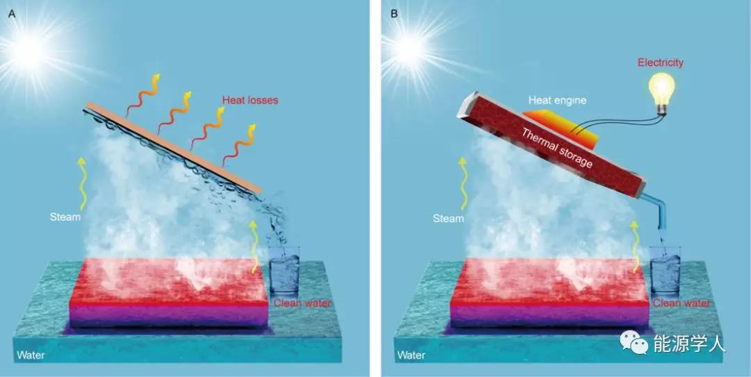 图1. 界面太阳能蒸汽冷凝过程示意图:(A) 传统界面光热转换设计,蒸汽冷凝过程中,其蒸汽焓被释放到环境中;(B) 蒸汽焓收集及利用设计,结合了热存储及热电转换功能,从而实现水电联产。