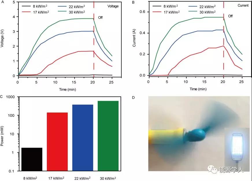 图3. 太阳能产电性能:(A) 不同光照强度下产生的开路电压;(B) 器件在不同光照强度下产生的短路电流; (C) 在不同光照强度下产电的功率;(D) 器件所产生的电能驱动风扇和LED的光学照片。在(A)和(B)中,20 分钟后关闭光源,器件的开路电压和短路电流依然保持输出,持续输出时间可通过热存储设计有效调控。