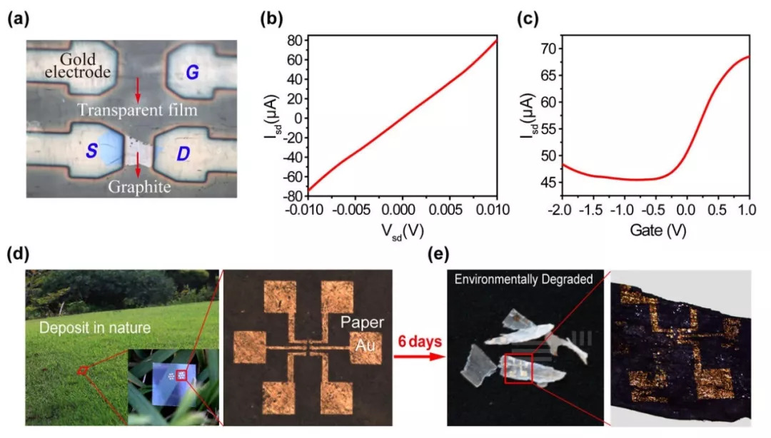图4展示了各向同性透明纸作为电子器件衬底的一个应用。将透明纸作为石墨烯晶体管衬底材料,其中源-漏极电流随着源漏极电压的变化显示典型的欧姆接触,源-漏极电流随着门电压的变化图(源漏极电压为10mV),显示二极管的典型特性,证明透明纸可以应用于柔性透明电子器件衬底材料。这种器件使用后可抛弃,其生物降解特性使其可以回归自然,不会危害到周围环境。
