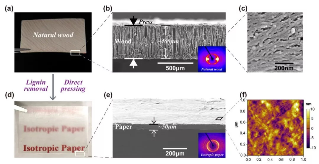 本文研究者从另一个角度出发,摒弃了传统方法中纳米纤维素纤维的制备这一核心步骤,发展了一种自上而下(Top-down)的制备透明纸的方法(图1),这种方法不需要纳米纤维素纤维的制备过程。它只包括简单的两个步骤:去除木质素以消除木质素中的有色基团对光的吸收;利用压力将去除木质素的木片压实,消除散射源达到光学均匀性和透明性。相比于传统自下而上的方法,由于自上而下的方法不再需要纳米纤维素纤维的制备、分离和浓缩步骤,因此解决了传统方法工艺复杂、耗时、耗水、耗能的问题。同时,该方法可推广到利用草本原料制备透明纸,如竹子、草等,将进一步降低透明纸的成本。