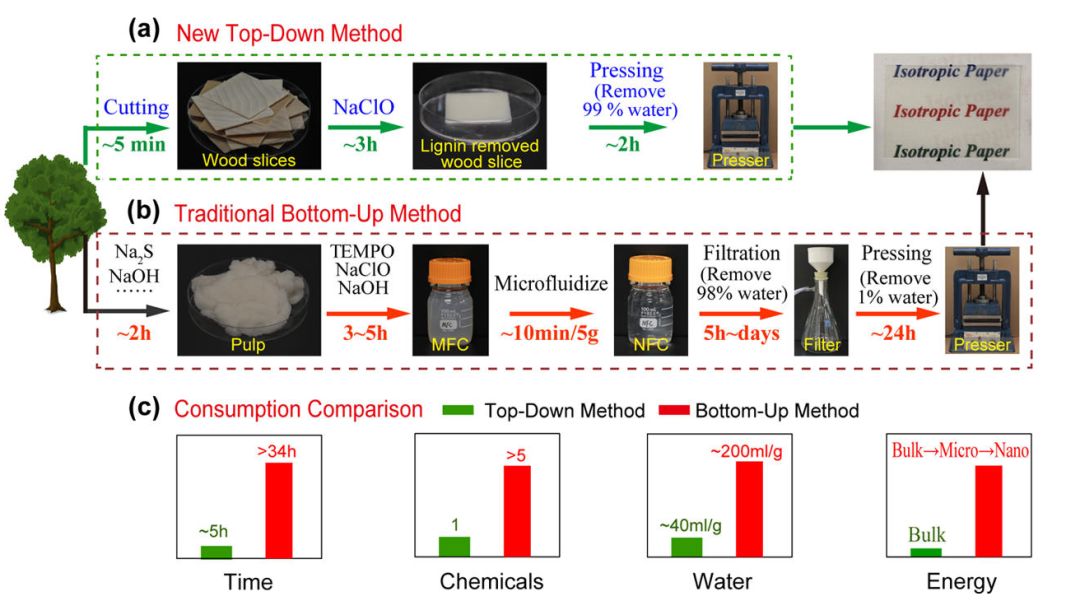 图5 本自上而下与传统的自下而上的透明纸制备方法的详细对比。
