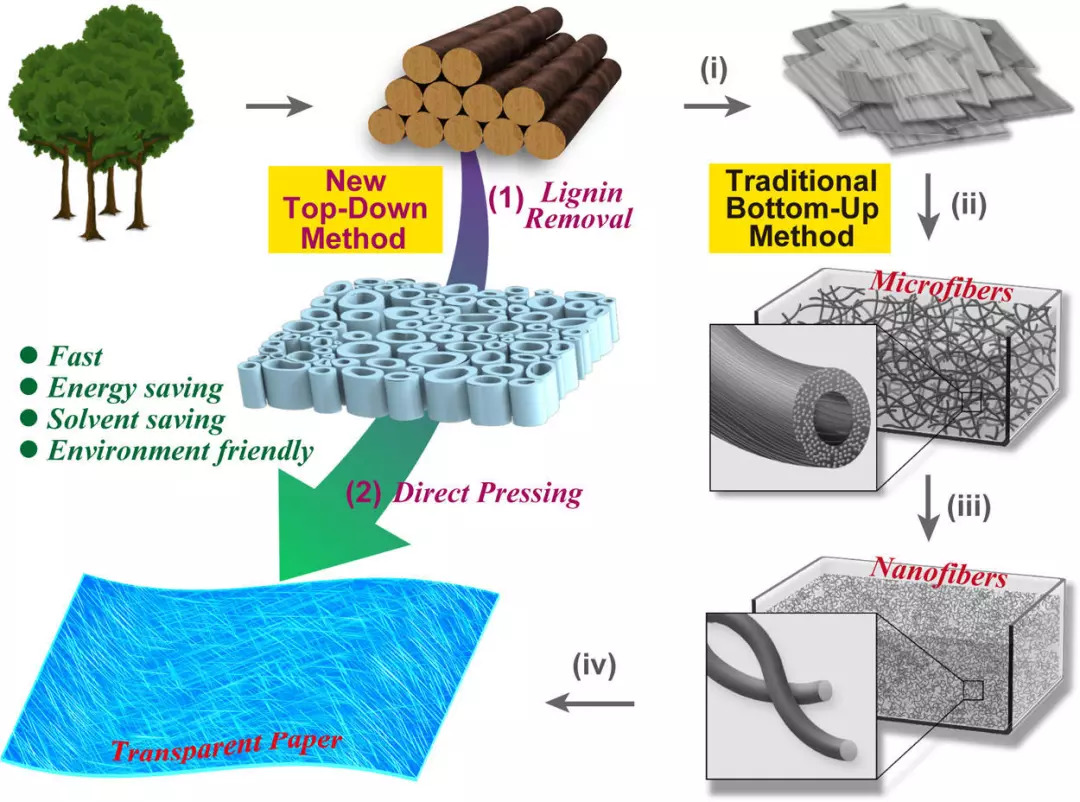 纳米纤维素纤维因具有透明、强度高、原料丰富、环境友好等特点被广泛应用。其中由天然纳米纤维素纤维组成的透明纸是目前最有望成为取代传统电子衬底材料的材料。传统的制备透明纸的方法是一种自下而上(Bottom-up)的制备方法,它主要包括两步:首先利用机械或者化学的方法将纤维素纤维从木材中分离出来,得到微米纤维素纤维;再通过多步骤处理,形成纤维素纳米纤维。这种自下而上制备透明纸的方法的关键技术是将微米级的纤维素纤维分离成纳米级的纤维素纤维,消除纤维素纤维的光散射从而实现透明。但是纳米纤维素纤维的分离、漂洗、浓缩等过程使得这种自下而上的方法低效、昂贵以及环境不友好。