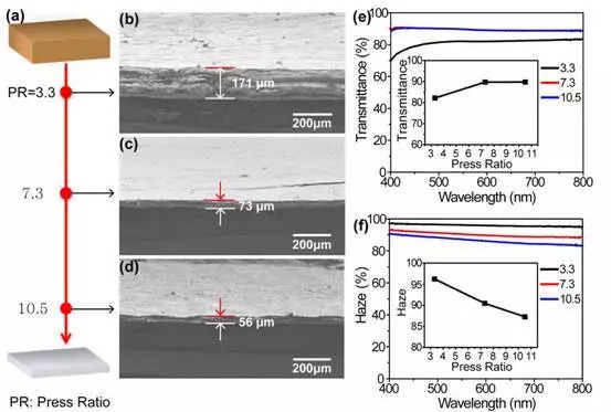 图3展示了这种自上而下的方法可以通过压缩比(PR)方便地调控透明纸的密度从而调控光学性质。图中显示,随着PR的增大,透明纸的透过率增加,但到达一定压缩比后,透过率到达最大值,基本稳定在90%左右;但随着PR增大,雾度持续减小,这反映了其中微结构的变化。