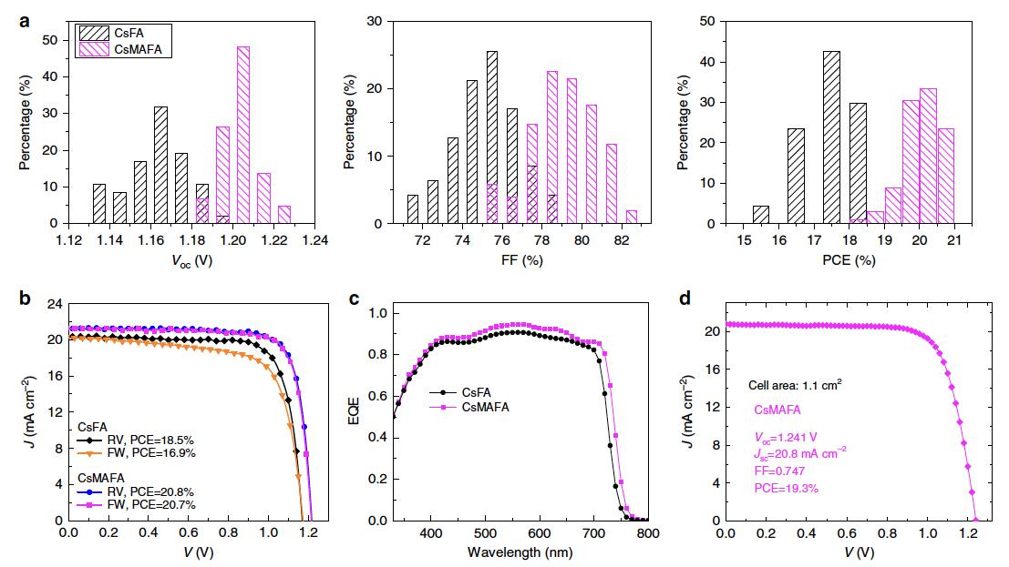 图1:引入偶极性甲胺(MA)阳离子后宽带隙钙钛矿太阳能电池的光伏性能比较,少量甲胺离子的加入可以显著提升电池的开路电压和填充因子,抑制电池的J-V迟滞现象,小面积电池转换效率高达20.7%,大面积器件效率达19.3%。
