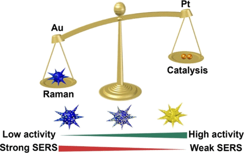 该课题组在多功能纳米酶的设计和合成上亦取得了一定的成果。前期工作中,该课题组及其合作者成功制备了同时具有拉曼活性和过氧化物酶模拟酶活性的Au纳米颗粒,并用于活体动物组织内(如脑内、瘤内)重要生物分子(如葡萄糖、乳酸)的检测,以及药物治疗中药效的评估(ACS Nano, 2017, 11, 5558-5566)。然而由于Au纳米颗粒的催化活性较弱,整个检测过程需要半个小时,大大限制了其实际应用。为解决此问题,该课题组引入了催化性能优异的Pt,制备出高活性的Au@Pt纳米颗粒。然而Pt层的引入使得Au表面拉曼性能减弱,因此为制备出同时具有Au核优异的表面拉曼性能和Pt壳较强催化性能的Au@Pt纳米酶,该课题组与betway88西汉姆联betway88西汉姆联张学进课题组合作,利用模拟和实验研究了不同含量Pt对Au的拉曼性能和催化活性的影响。最终研究结果表明当Pt含量为2.5%(Pt/Au摩尔比),该双功能纳米酶具有优异的拉曼性能和催化活性,可用于表面增强拉曼对双氧水的快速高灵敏检测。相较于Au纳米酶,Au@Pt纳米酶有效缩短检测时间为2min,且将检测灵敏度提高了1-2个数量级。(ACS Applied Materials & Interfaces, 2018, 10, 12954-12959)
