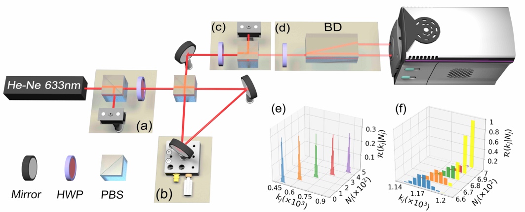 图2,实验装置图[(a)-(d)]与光电探测器标定结果[(e), (f)]。