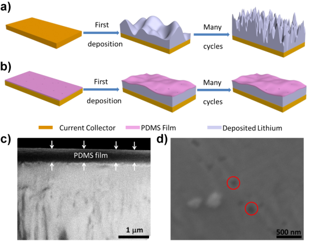 朱嘉教授课题组首次着眼于常见的聚合物聚二甲基硅氧烷(PDMS),通过简单的不同转速旋涂工艺控制膜厚及不同浓度酸处理控制孔洞大小分布,制备出多孔的PDMS 膜来保护锂电极(图一),抑制了循环中枝晶锂的生长,极大地稳定了循环效率,提高了循环寿命(图二);此外由于PDMS的化学惰性,其与目前研发出的各种电解液具有极好的兼容性;从原料到合成工艺具有极高的成本优势,为规模化制备生产提供了新的方向。