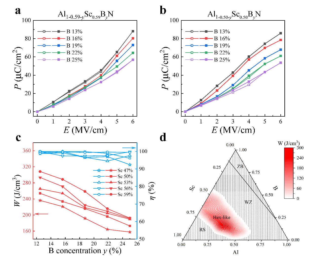 图 5 (Al,Sc,B)N体系的P-E曲线和储能性能