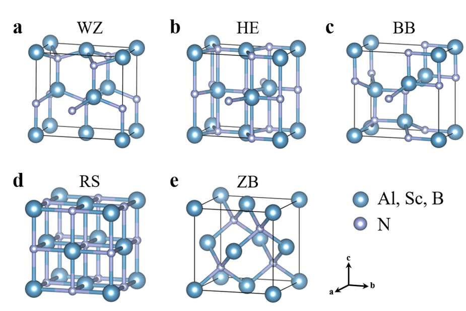 本研究系统性地考察了纤锌矿(WZ)、六方(HE)、岩盐(RS)、闪锌矿(ZB)以及β-BeO结构(BB)五种典型晶格结构(见图3)在(Al,Sc,B)N合金体系中的稳定性与转变路径。由于块体WZ-AlN极化状态稳定且难以在电场下发生翻转,研究发现顺电性的HE与BB结构在极化翻转过程中可作为中间态,成为实现可切换极化结构的重要调控手段。进一步分析表明,仅靠单一掺杂Sc或B元素不足以稳定HE或BB基态,因此本工作首次引入三元阳离子调控策略,旨在实现多晶格结构之间的精确转换,为高性能铁电材料的设计提供了新思路。