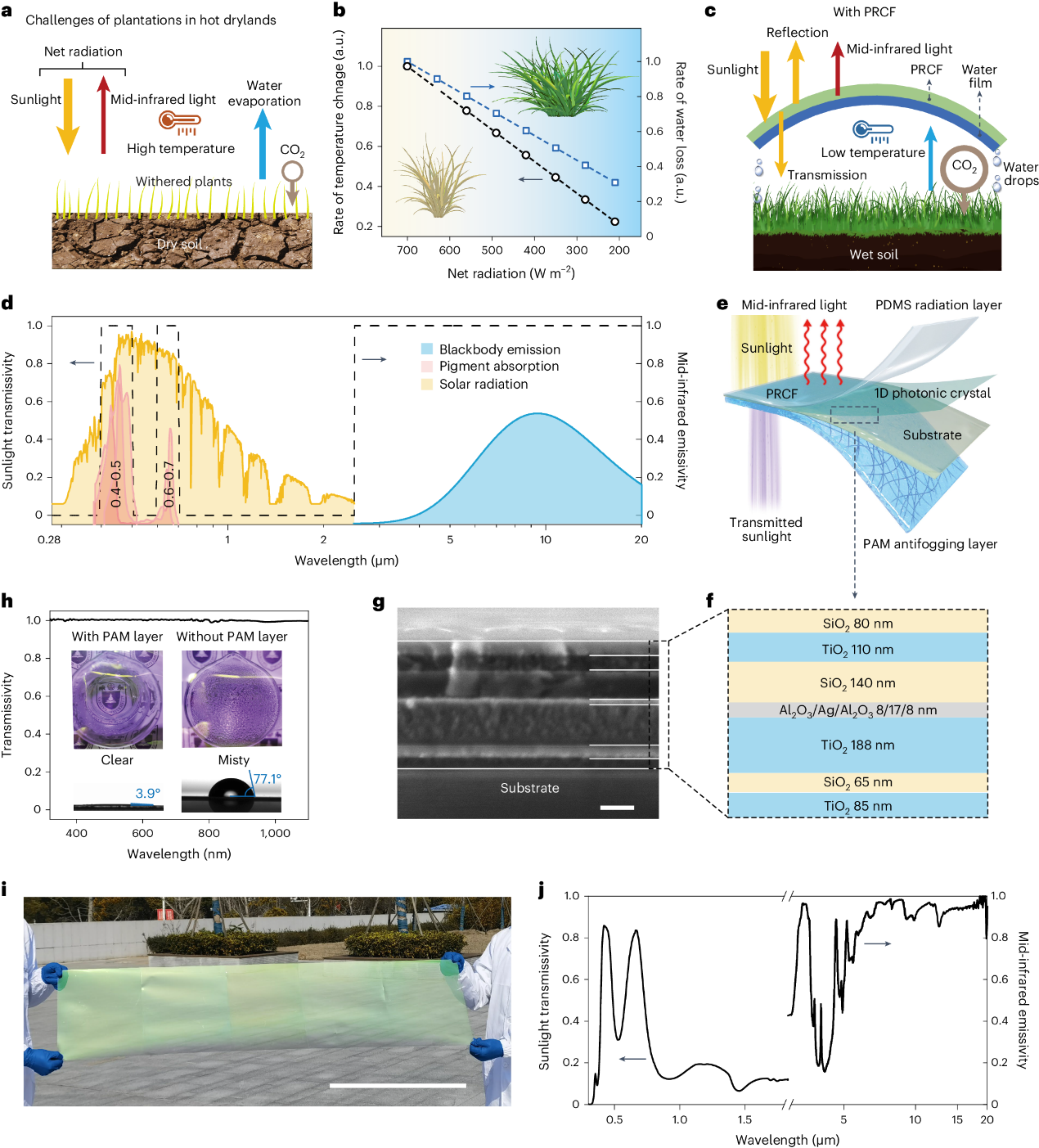 干旱地区常用的种植技术包括微雾喷淋、湿帘风机等方法,往往是高耗能、耗资源的,因此需要通过一种被动式降温保水策略来构建局部环境适于植物生长。研究团队通过温室模型模拟发现,室内气温变化率和耗水量很大程度上取决于净辐射能量输入(图1b),因此,辐射能量的管理是创造凉爽潮湿环境以支持干旱地区植物生长的关键。辐射制冷通过反射太阳光(0.3-2.5μm)和辐射中红外能量(2.5-20μm)实现零能耗的被动制冷效果,在过去的十年中已得到广泛研究。同时,一些针对特殊场景需求如太阳能电池、智能窗和温室等的选择性光谱设计也已被开发。然而,对于适用于植物光合作用的降温薄膜光谱要求将更为严格。考虑到光合作用的特定作用波段,降温薄膜的理想光谱应将0.4-0.5μm及0.6-0.7μm的光合作用有效光透过,0.5-0.6μm及0.7-2.5μm的带来额外热效应光反射,2.5-20μm的热辐射光尽可能发射(图1c,d)。基于此,研究团队提出的利于植物光合作用的辐射制冷膜(PRCF)由三明治结构构成(图1e),分别是太阳光波段高透、中红外波段高发射的聚二甲基硅氧烷辐射层、太阳光选择性透过的一维光子晶体层(图1g,f)和起到防雾作用的聚丙烯酰胺水凝胶层(图1h),实现了宽带高选择性光谱管理。该PRCF可通过规模化手段实现米级的材料制备,并获得与理想光谱一致的实际光谱(图1i,j)。