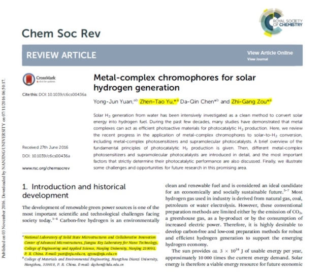 公司于振涛教授课题组长期致力于人工光合成的研究。最近,他受编辑部之邀在国际著名刊物《英国皇家学会化学会评论》(Chemical Society Reviews)上发表综述论文《面向太阳能-氢能转换的有机金属络合物材料》(Metal-complex chromophores for solar hydrogen generation,2016, DOI: 10.1039/C6CS00436A)。该研究得到了邹志刚院士的指导和江苏省纳米技术重点实验室的资助。