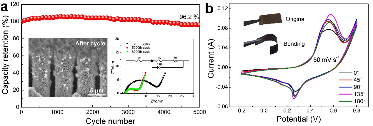 图3.(a)MCo2S4/Ni阵列单电极在电流密度10 A g-1下经历5000次充放电循环的电容保持率,插图为循环后SEM图;(b)电极在不同弯曲角度下的CV曲线。