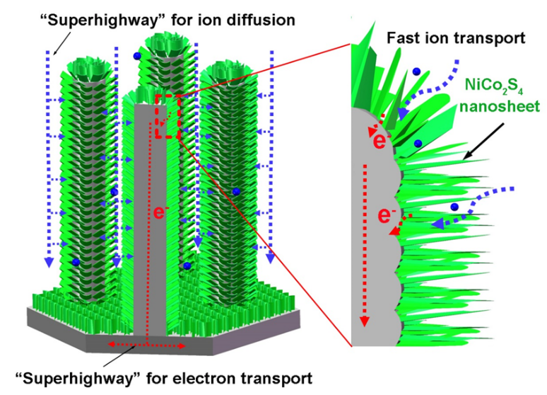 图1. 新型阵列电极在电化学储能过程中离子和电子的传输路径。