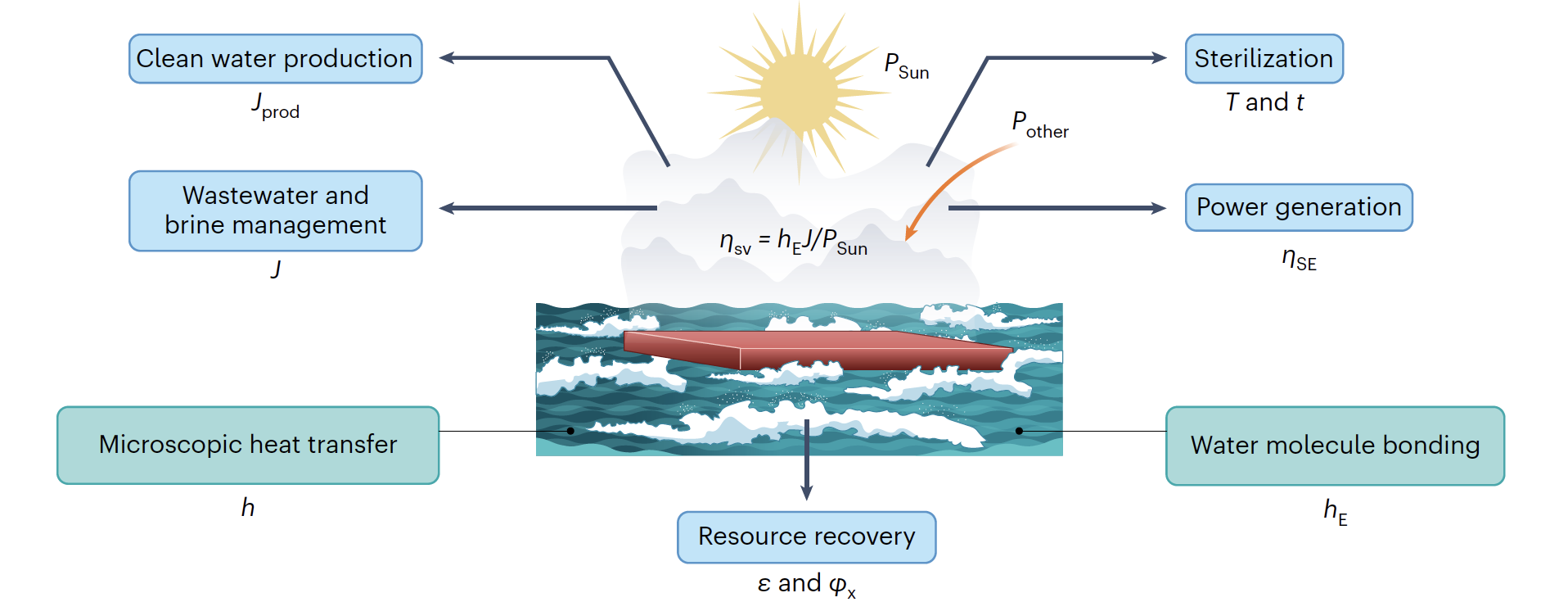 在该论文中,作者首先讨论了太阳能蒸发技术最具前景的应用以及对应的追求指标,包括:淡水获取、污水与卤水处理、资源回收、蒸汽灭菌以及电能产生。随后,作者讨论了与蒸发性能息息相关且亟待探索的基础问题,例如微观热传输过程以及水分子间相互作用。此外,作者对太阳能之外的其他能量形式进行了讨论,以用于进一步提升蒸发性能。