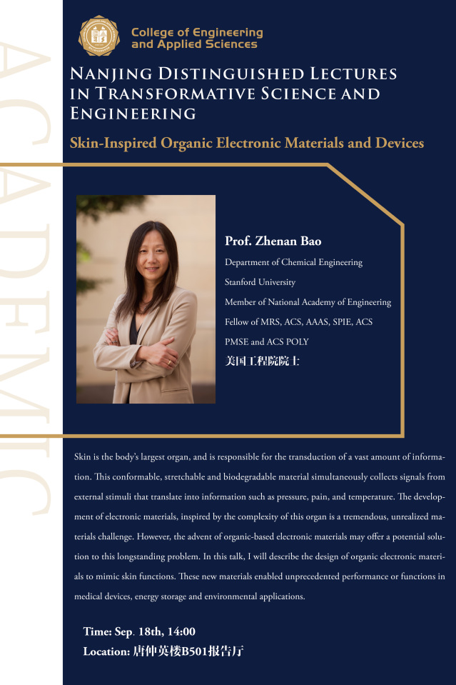 我们有幸邀请到美国工程院院士、斯坦福大学鲍哲南教授,作为TSE Lectures系列讲座的开讲嘉宾。鲍哲楠教授学术报告信息见下,欢迎各位老师和同学参加!