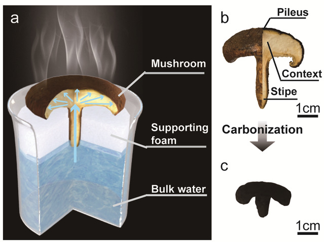 图1. (a) 基于香菇的光热转化器件示意图,(b, c)碳化前后香菇的宏观结构