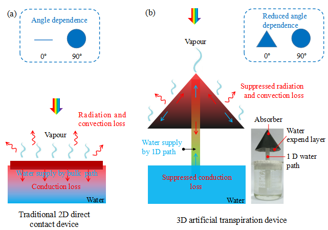 图3. (a) 传统的光-热(蒸汽)转化器件示意图,(b) 三维(3D)人工蒸腾器件示意图。