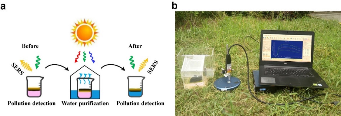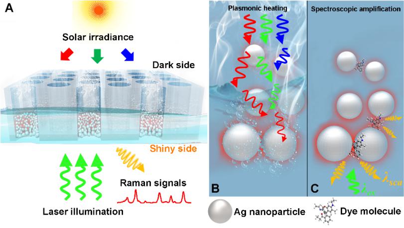 朱嘉团队设计了一种非对称的等离激元结构(APS),将这二者巧妙结合在一起,使该结构的不同面分别具有优异的光谱放大和光热转化的特性。APS的金属面(正面)在400~530nm波段具有超过95%的吸收率,能够检测的探针分子浓度低至5×10-12 M,拉曼增强因子高达109;此外,由于其宽带特性,该基底能检测多种医学、渔业、染料分子,样品具有良好的均匀性和稳定性。APS的黑色面(反面)在太阳光全光谱的平均吸收率超过90%,在低倍太阳光照下可实现超过80%的光热转化效率。基于非对称的等离激元结构的双重特性,率先实现了现场水质检测与水纯化的一体化、便携式解决方案。