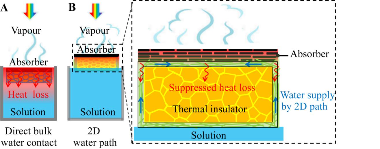 图2. (A) 传统的光热-蒸汽转换装置示意图,(B) 拥有二维水通道的氧化石墨烯基光热-蒸汽转换装置示意图。