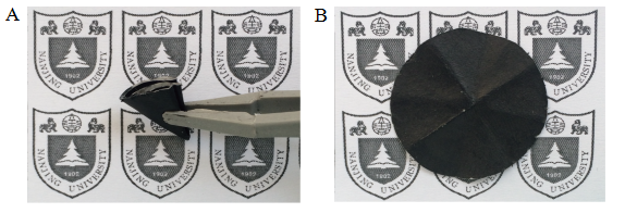 图1. (A) 氧化石墨烯折叠后的光学照片,(B) 氧化石墨烯薄膜折叠50次后的光学照片。