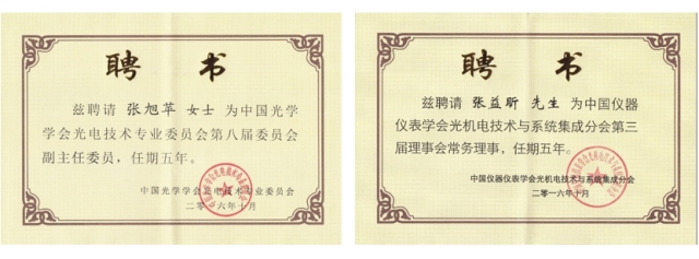 图9:“中国光学学会光电技术专业委员会第八届委员会副主任委员”聘书以及“中国仪器仪表学会光机电技术与系统集成分会第三届理事会常务理事”聘书