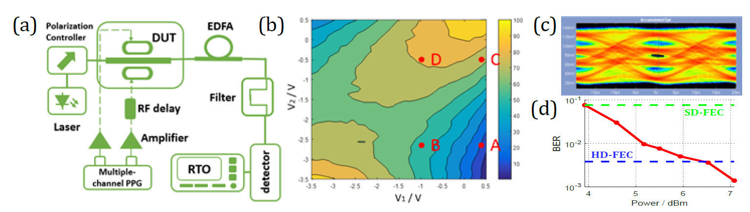 基于此器件的实验表明,静态消光比可达20dB以上。尤其是50Gb/s高速调制下,消光比可达9.4 dB,信号/噪声的比值(SNR)可达7.0,如图3(c),(e)所示。相比于同样参数的单跑道型谐振腔调制器[图3(d),(f)]有大幅度提升,且器件的射频驱动电压较低仅有2.3V。此外,此器件还可以进行四阶脉冲振幅调制(PAM-4,指调制光强有4个状态)。相对于常规的只有两个输出光强状态的调制(OOK),PAM-4调制对消光比要求较高,双跑道型谐振腔调制器原则上有较大优势。PAM-4调制通常需要两个比特信号合成为一个四阶信号,这一步通常通过外加数-模转换器(DAC)实现(但会增加器件尺寸与功耗),也可以在无DAC情形下在调制器内部实现(较为理想,但难度较大)。此前他人的工作利用两个常规谐振腔调制器实现了30Gbaud, 60Gb/s的无外加数-模转换器(DAC-less)的PAM-4调制。此工作中,双跑道型谐振腔调制器的多变量非线性传输函数给寻找适当的PAM-4调制状态带来了较大困难,研究中通过理论分析,对非线性传输函数发展了适当的非线性变换,克服了难点,找到了适当的PAM-4调制状态。最终实现了50Gbaud, 100Gb/s的无外加数-模转换器的PAM-4调制(图4),且调制电压与功耗比此前工作明显降低,性能大幅提升。