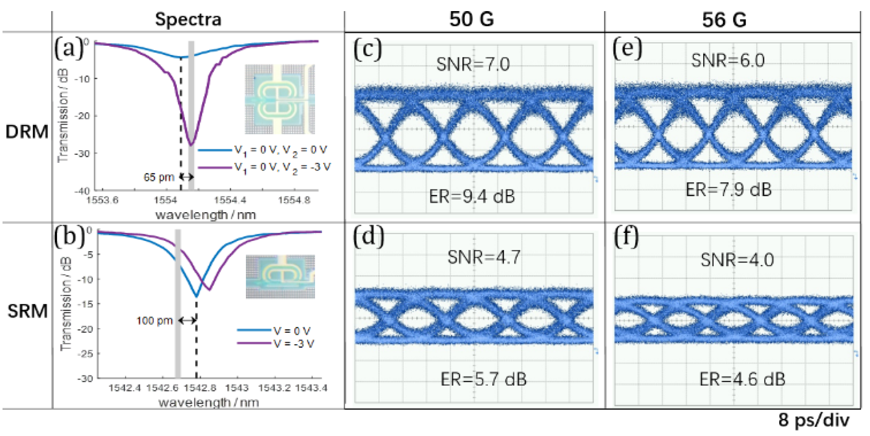 图3、器件实验结果。双谐振腔调制器(第一行)与单谐振腔调制器(第二行)比较。(a)-(b)光谱; (c)-(d) 50 Gb/s调制眼图;(e)-(f) 56 Gb/s调制眼图。