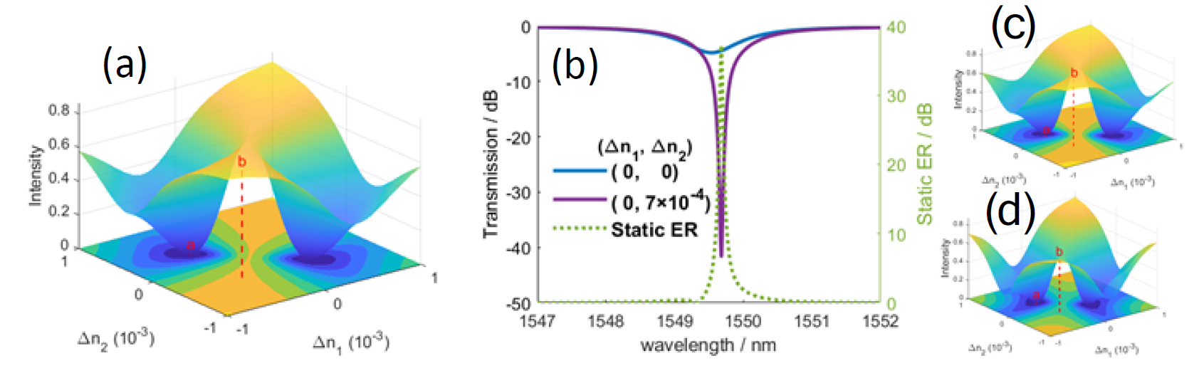 图2、器件理论结果:(a)输出光强与两谐振腔中折射率调制的关系I(n1, n2);其中图中a、b点为器件的两种工作状态,a点为消光状态。(b)两种工作状态的光谱。(c)器件的谐振腔2的品质因子增加50%时的I(n1, n2)。(d)器件的耦合常数减少20%时的I(n1, n2)。
