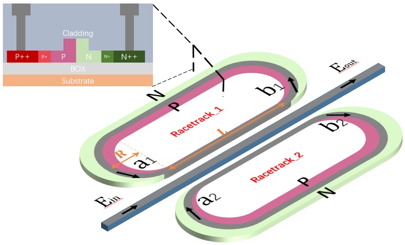 基于微谐振腔的硅光调制器通常将输入波导与谐振腔设计为临界耦合以提高器件的关键性能(如消光比)。理论上,在临界耦合状态下,器件的消光状态的输出光强严格为零(消光比无穷大)。然而由于临界耦合状态稳定性较差,器件的参数(尺寸、掺杂等)稍有波动就会明显偏离临界耦合。实际使用中器件的性能通常会受到较大的影响。尤其在高速调制(>30Gb/s)的情形下,很难达到较高的消光比。