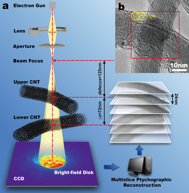 图2.(a)三维成像光路以及原理图。(b)多壁碳纳米管的透射电镜图像。