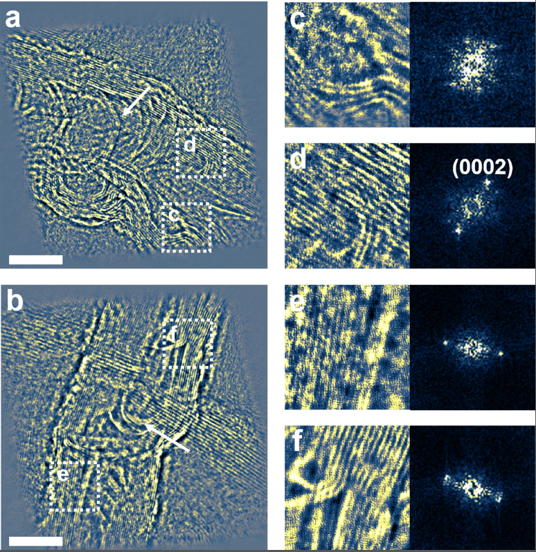 图4.(a-b)在两根碳纳米管位置的重构相位图像。(d-f)对应位置的放大图像以及对应的频谱。