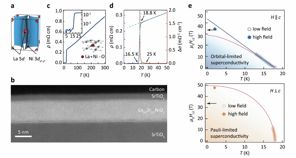 自1986年铜氧化物高温超导体被发现以来,非常规高温超导机理一直处于凝聚态物理的研究前沿。无限层镍氧化物作为一类新型的非常规高温超导体系,具有与铜基超导体类似的准二维层状晶体结构以及3d9最外层电子构型,为高温超导机理的研究提供了一个崭新的平台。理论与实验研究表明这两类超导体系也存在明显的区别,比如镍基超导体的费米面存在明显的多带特征,这与铜氧化物中被广泛接受的单带物理图像不一致,研究它们之间的联系与区别对揭示非常规高温超导的机制尤为重要。对于超导体而言,上临界场(Hc2)可以给出关于超导维度以及库珀对(Cooper pairs)拆对机制等重要信息,为理解超导机理提供重要帮助。前期研究发现,Nd1-xSrxNiO2体系的上临界场呈现出泡利顺磁极限所导致的各向同性特征,这一结果与铜基超导体中单带物理所主导的各向异性的输运性质有着显著的不同,为理解非常规高温超导机制带来了新的挑战。