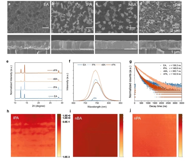 图1.不同醇类制备钙钛矿薄膜的表征。(a-e)钙钛矿薄膜中的碘化铅分析。(f - g)钙钛矿薄膜的质量分析。(h-j)钙钛矿薄膜的均匀性分析