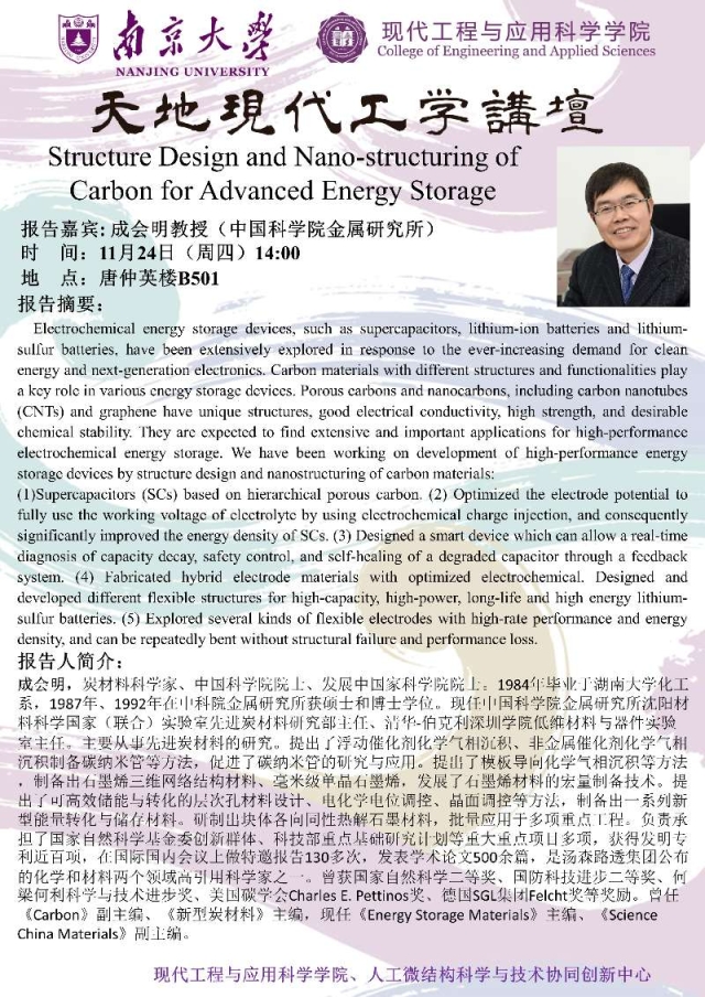 【天地讲坛预告】成会明教授:Structure Design and Nano-structuring of Carbon for Advanced Energy Storage
