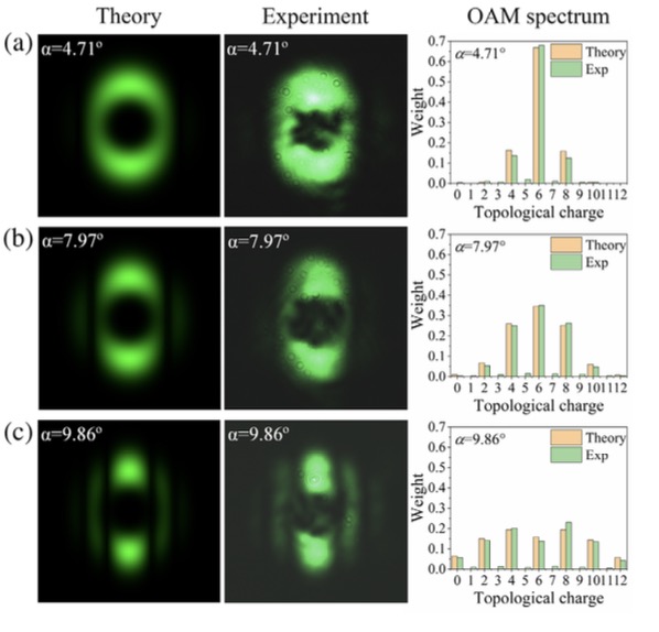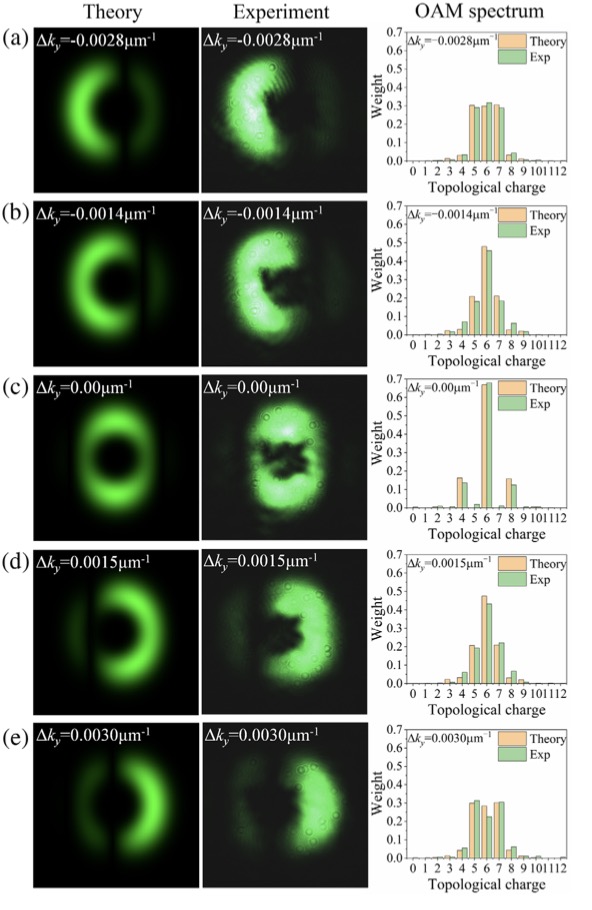 该研究直接从非线性波动方程出发,利用格林函数进行求解,得到了携带OAM光束的倍频场的一般表达式,倍频光的强度分布和OAM谱分布是由线性动量和轨道角动量共同定义的相位匹配条件决定。在实验上,他们利用一块周期极化光学超晶格作为倍频晶体,通过改变入射光相对于铁电畴壁的角度,实现了共线倍频、非线性布拉格衍射和非线性拉曼-内斯衍射三种非线性参量过程,它们分别对应于不同的相位匹配构型,或者说是不同的纵向波矢失配(图1)。在不同的相位匹配构型下,倍频光的强度分布和OAM谱呈现出不同的特性:对于共线过程,倍频光携带单值的OAM,其等于基波光携带OAM的两倍;对于另外两种过程,情况则比较复杂。非线性布拉格衍射,倍频光的强度分布在水平和竖直方向对称,OAM谱仅包含偶数阶分量(图2);对于非线性拉曼-内斯衍射,倍频光的强度分布不再具有对称性,OAM谱涵盖了所有的整数阶分量(图3)。倍频光OAM分量的权重由相位匹配构型和相位失配量的大小决定。