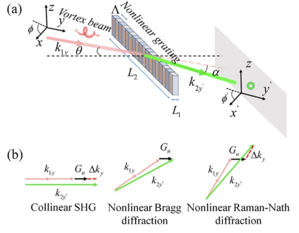 能量、线性动量和角动量是三个基本的守恒物理量。在非线性光学中,相互作用的光波之间会交换能量、动量和角动量。能量在不同频率分量之间的流动方向,一般由和线性动量相关的传统相位匹配条件决定。光子的轨道角动量(Orbital Angular Momentum, OAM),自1992年被荷兰莱顿大学的Allen等人确认其物理存在以来,其产生、调控和探测成为国际光学领域的研究热点之一,并在上转换探测成像和量子信息技术等诸多领域展现出诱人的应用前景。在非线性频率转换过程中,OAM会从基波转移至谐波,但OAM守恒只是在特定的条件下成立,例如,共线过程倍频光携带的OAM等于基波光的两倍。对于一般情况,OAM的非线性频率转移机制实际上并不明确。在Allen等人关于携带OAM光束倍频研究的开创性工作中,也仅只考虑了和线性动量相关的相位匹配条件。最近,胡小鹏、张勇和祝世宁教授等人合作开展了OAM的非线性频率转换机制研究,在实验上展示了OAM的非线性频率转换,强烈依赖于由线性动量和轨道角动量共同定义的相位匹配条件。相关成果以“Phase-Matching Controlled Orbital Angular Momentum Conversion in Periodically Poled Crystals”为题发表于《物理评论快报》(Physical Review Letters 125, 143901 (2020), DOI: 10.1103/PhysRevLett.125.143901)。betway88西汉姆联物理学院博士研究生陈琰和2017级硕士毕业生倪睿为论文的共同第一作者,吴曜东、杜立和魏敦钊等同学对本工作亦有重要贡献。胡小鹏教授、张勇教授和祝世宁院士为文章的共同通讯作者,betway88西汉姆联为论文的唯一单位。相关研究得到了国家重点研发计划、国家自然科学基金、江苏省自然科学基金前沿引导技术基础研究专项、betway88西汉姆联卓越计划和中央高校基本科研业务费等的支持。