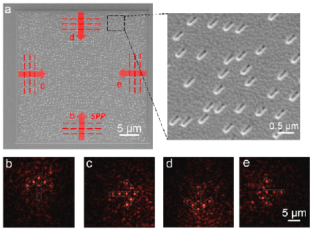 (b-e)实验测得由不同方向传播SPP所重构出的空间全息图。