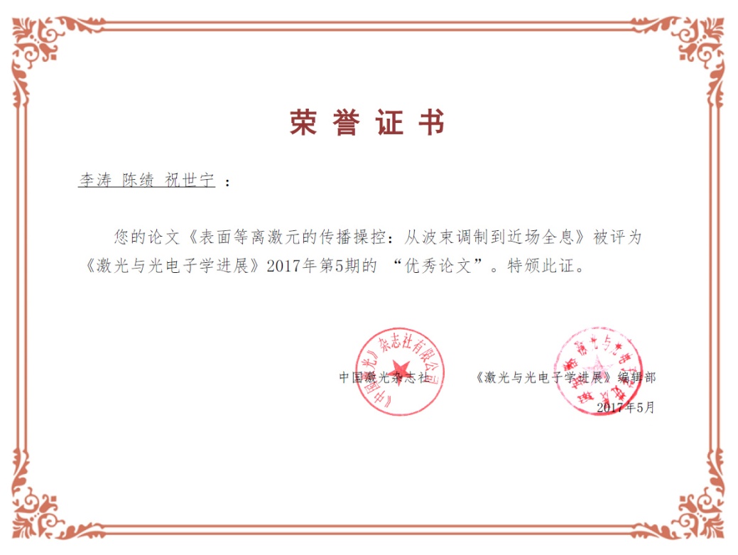 公司李涛教授、祝世宁院士研究组在过去几年中发展并推广了一套新颖的面内衍射调控SPP波的方法,实现了诸如Airy波束、准直波束、宽带聚焦与波分复用等效应和功能。后来他们进一步将全息思想引入进来,实现了在金属表面蜿蜒行走的SPP波束。相关研究大大加深了人们对SPP波束特性的理解,并提供了强大的微纳光场调控的手段。今年五月份,李涛教授受邀在《激光与光电子学进展》发表综述文章《表面等离激元的传播操控:从波束调制到近场全息》,系统介绍了该领域的研究进展(该综述论文被评为该刊物第五期优秀论文,见图一)。该文章后半部分还强调,等离激元近场全息将可能是今后发展的重要方向。