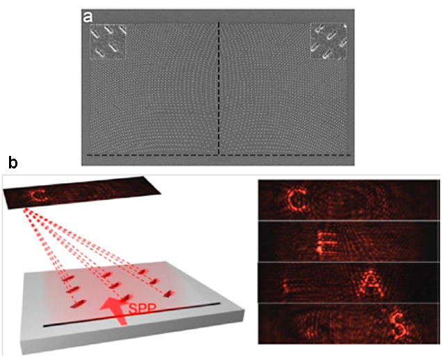 图三:(a)SPP传播与空间偏振联合复用的全息样品图,(b)空间全息示意图及最终实验获得的四重解复用全息成像。