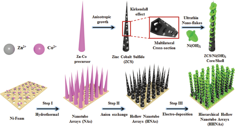 图1. 对于在泡沫镍上分步合成中空ZCS NAS和ZCS/Ni(OH)2的示意图