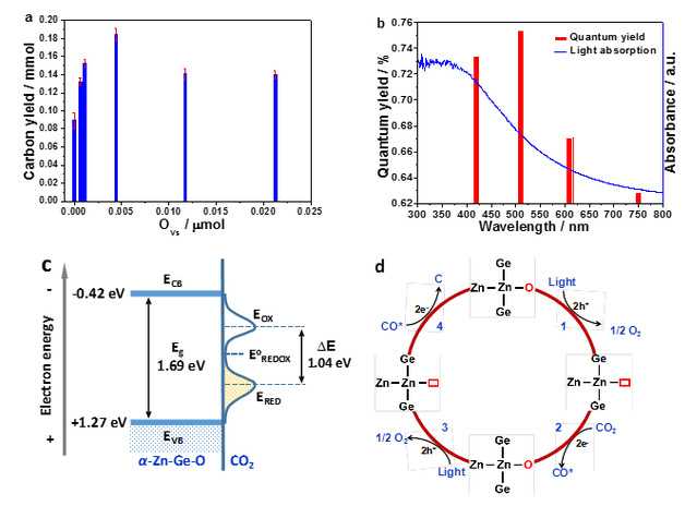 图二 a. 光致氧空位浓度与碳产率关系;b. CO2分解反应量子效率;c. 光催化材料的能级位置与CO2分解能量需求;d. 分子分解反应经历了两个光反应与两个暗反应步骤。