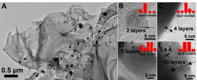 图2. 不同石墨烯包覆层数的Mn+@G电催化材料TEM形貌图