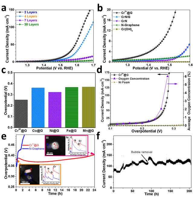 研究团队提出利用强电子受体的3d过渡金属离子与石墨烯材料配位结合,有效降低石墨烯电子转移势垒,更易于调控石墨烯的费米能级。经实验表征与理论计算证实,石墨烯包覆金属铬离子前驱物(CrN@G)经阳极氧化活化后可得电子受体Cr6+与石墨烯的强相互作用的Cr6+@G。由于Cr6+/Cr3+转变电位(1.36VRHE)接近水氧化热力学电位,因此可在较低过电势下通过Cr6+ d轨道和C p 轨道的d-p轨道杂化机制有效降低石墨烯Ef及C-O物种活化势垒,提升OER活性。该研究报道的Cr6+@G 在水氧化性能为10 mA cm-2时所需过电势仅为197 mV,在100 mA cm-2条件下稳定维持超过200小时。该性能远超目前报道的碳基OER材料,是目前已报到最好的OER电催化材料之一。 该工作以“Unlocking the potential of graphene for water oxidation from orbital hybridization strategy”为题发表在Energy & Environmental Science 2018, DOI: 10.1039/C7EE02972A。