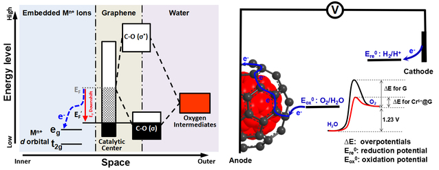 能源转换、存储和利用需要开发廉价、高效的新能源材料。析氧反应(OER) 是包含(光)电化学分解水制氢(2 H2O → 2 H2 + O2)、二氧化碳转换利用(x CO2 + y/2 H2O → CxHyOz + (4x+y-z)/4 O2)以及金属-空气电池(MxO → xM + 1/2 O2)在内的多种能源转换过程的速率决速步骤,改善OER反应动力学对提升能量转换效率至关重要。石墨烯作为理想的电极材料,已获得广泛重视与利用,但在OER反应中,仍受限于低催化活性与低稳定性。在石墨烯催化OER反应过程中,反应中间物种*OH, *O, *OOH与C原子形成C-O成键(σ)与C-O反键(σ*)。在阳极正偏压下,石墨烯费米能级(Ef)不断降低,降至σ能级位置满足电子由氧物种向C传输的热力学条件,使得水分解反应发生。相较于理论水氧化平衡电极电位(1.23VRHE), 绝大多数电催化材料需超过350 mV过电势才能实现10 mA cm-2水氧化性能,这是由于OER各中间反应步存在较大活化能垒,即动力学因素限制。如何有效降低石墨烯Ef并减小OER各中间活性物种转变活化能对改善水氧化性能至关重要。