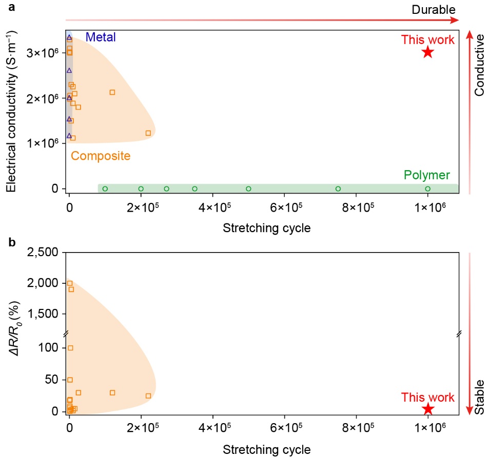 导电弹性体在软体机器人等重大新兴领域中发挥至关重要的作用。理想的导电弹性体需同时具备10^6 S/m的金属级电导率以有效降低器件内阻,并能在经历百万次拉伸循环后依然保持性能稳定,以满足应用场景的需求。这对现有导电弹性体材料构成了巨大挑战。目前主流策略是将导电填料掺入高分子基体形成复合材料,但存在明显问题:刚性填料(如金、银纳米线)在拉伸过程中倾向于在高分子基质中随机迁移,导致循环拉伸后电阻显著增加;而柔性填料(如镓基液态金属)在反复形变过程中则容易在高分子基体中发生聚集或从内部泄漏,造成电导率大幅波动。