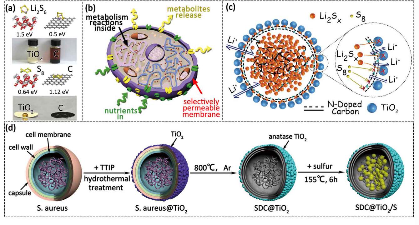 (a)TiO2与碳的极性研究,图中计算和实验显示TiO2与多硫化物,非极性碳与S8作用较强,反之则作用较弱(b) 仿生思路:生物细胞膜的选择性透过膜控制营养物质和代谢产物进出。(c) “仿生”双极性正极结构。内部非极性吸附支撑硫,外壳层限制多硫化物;(d) 以金色葡萄球菌为初始结构的硫正极材料制备过程。