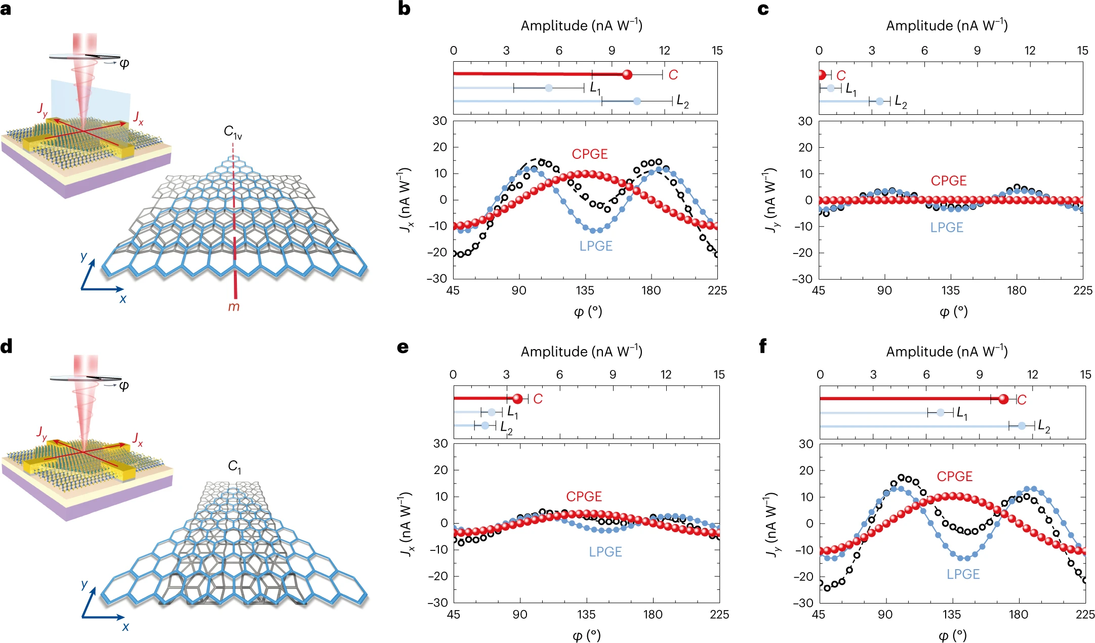 图2:具有不同对称性的异质界面的圆偏振自旋光电流。a, 具有C1v对称性的异质界面示意图,m表示镜面对称性。b,c, 具有C1v对称性的异质界面测量的Jx和Jy,其中CPGE和LPGE分别表示圆偏振自旋光电流效应和线偏振光电流效应。d, 具有C1对称性的异质界面的示意图。e,f, 具有C1对称性的异质界面测量的Jx和Jy。
