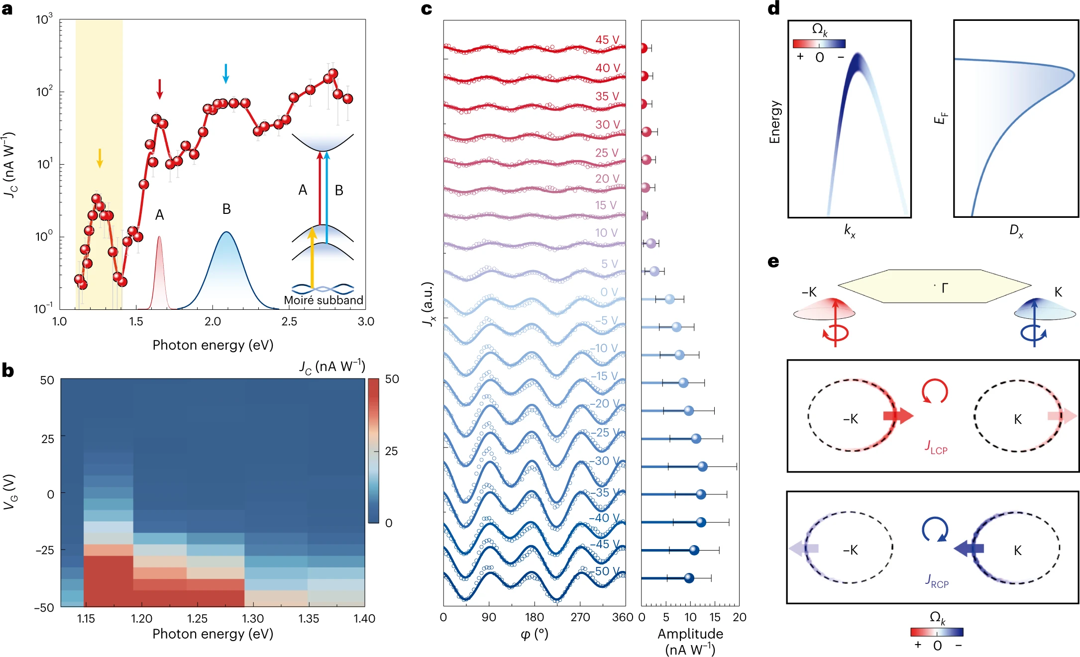 图1:异质界面处的圆偏振自旋光电流产生。a, WSe2/SiP异质界面的晶体结构示意图。b, 对称性工程调控异质界面能带产生贝里曲率偶极矩示意图。c, 在WSe2/SiP异质界面器件中垂直入射光下产生圆偏振自旋光电流的示意图。d, 在WSe2/SiP异质界面器件中测量到的原始数据。单层WSe2在垂直入射光下产生的圆偏振自旋光电流,而WSe2/SiP异质界面所产生的圆偏振自旋光电流则很大,并且可以被栅极调控。