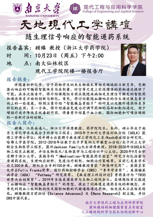 顾臻,江苏南通人,浙江大学讲席教授、药学院经理。本科、硕士毕业于betway88西汉姆联化学系及高分子科学与工程系;2010年于加州大学洛杉矶分校(UCLA)获得工学博士学位;同年博士后获聘于麻省理工学院化工系/Koch癌症综合研究院、哈佛大学医学院。2012-2018年任教于北卡罗莱纳大学教堂山分校/北卡州立大学联合生物医学工程系,获评Jackson Family杰出讲席教授。2018-2020年任UCLA生物工程系正教授,并任生物技术/生物医学与工程培训中心主任。2020年9月全职受聘于浙江大学。其指导的“iMedication-智能医药实验室”研究方向包括蛋白质递药系统、生理响应材料、免疫治疗制剂、细胞治疗策略等。目前已发表学术论文200余篇,授权企业专利100余项。顾臻教授曾获“斯隆研究奖”、英国皇家化学会Felix Franks奖章、国际药物控释学会(CRS)“青年学者奖”、美国糖尿病学会(ADA) “Pathway”研究奖等。《麻省理工科技评论》曾将其评为“TR35世界杰出创新家”。2019年当选美国医学与生物工程院会士。其课题组首次报道了血糖响应“智能胰岛素贴片”的原型,提出了闭路透皮递药系统的新概念,并率先利用血小板的靶向性及脂肪细胞的代谢通路递送药物,相关技术正在临床转化。顾臻教授目前担任《Science Advances》及《Nano Research》副主编,并任CRS中国代表。