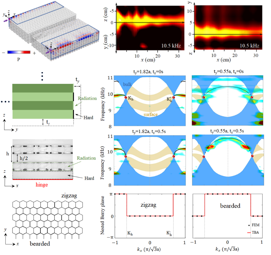 将目光投到更高阶的一维棱上时(即二阶拓扑),考虑两类典型的棱型:锯齿(zigzag)和胡须(bearded)。它们可被视为一对互补的棱,比如,一块完整晶体沿x方向截断形成两条棱,若其中一条为锯齿型,另一条则必为胡须型。其实,即便在多种棱型的情况下,一维棱态均可稳定存在,且互补的棱存在于互补的动量区域(布里渊区)。实验上,作者清楚地观测到不同的拓扑棱态均直接联接到一对Dirac点:锯齿棱态穿过布里渊区边界,而胡须棱态则穿过布里渊区中心(图3)。Dirac半金属中的这种“体-棱”对应关系的实质是:三维Dirac点(体拓扑荷为0)投影到一维棱上时,将分成一对互补的棱态,分别具有相反的棱极化。无论何种棱形貌,都支持一对互补的棱态,受Dirac半金属的拓扑保护而稳定存在。